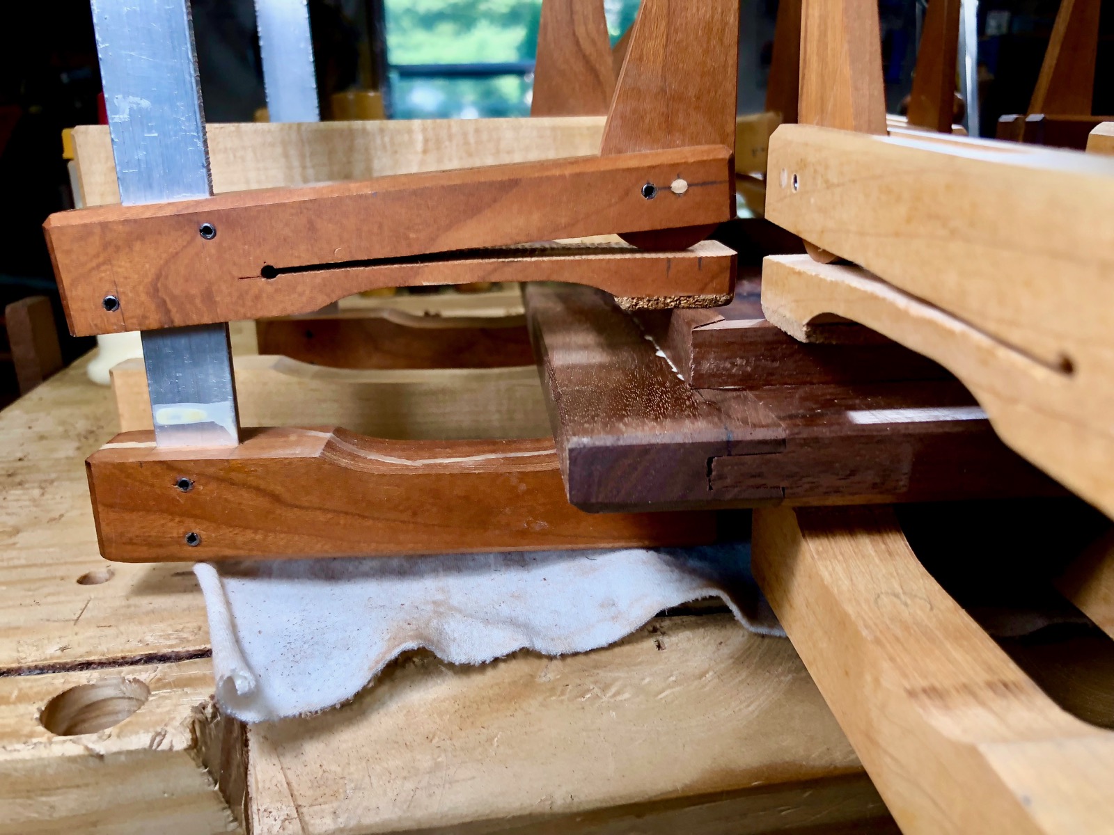 This session started with gluing up the top. Very little glue is needed, just on the small tenons.