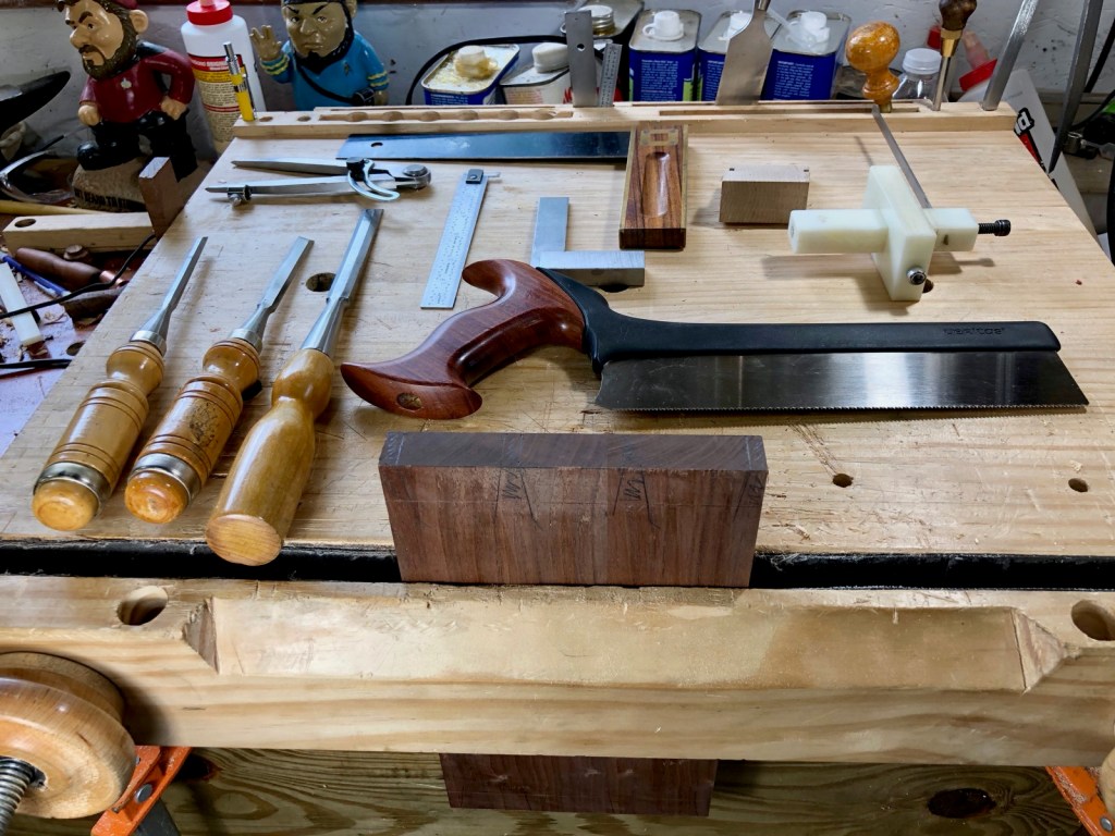 There are sharp chisels, my dovetail saw, my marking gauge, some squares, and a divider.