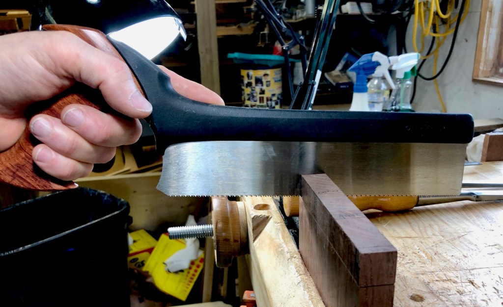 The first step is to cut precisely next to the lines I drew yesterday. This is done with a dovetail saw, a very exacting tool with a fine cut.