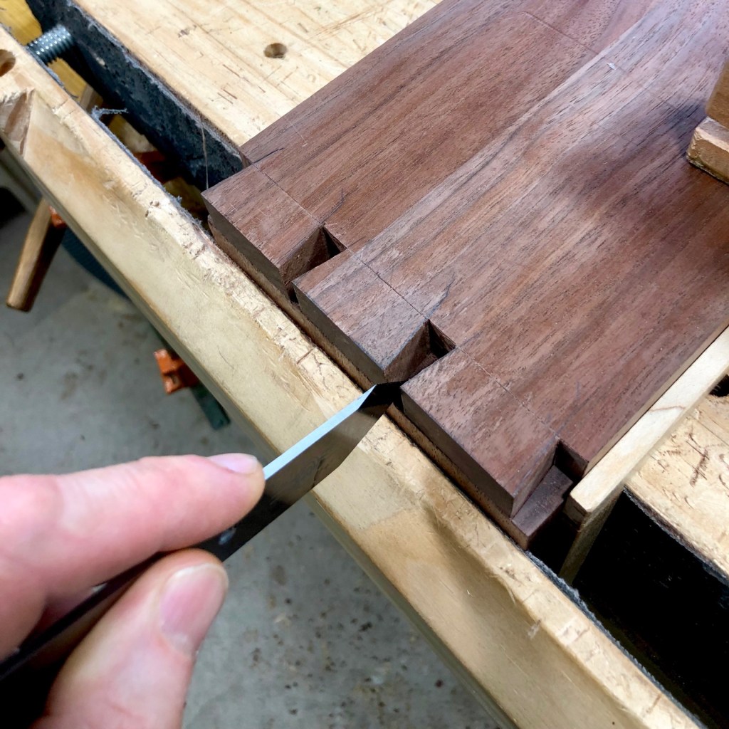 Fitting the pins to the tails can be tricky. The closer to the lines you cut the less you need to trim, but the higher the risk of cutting too much.