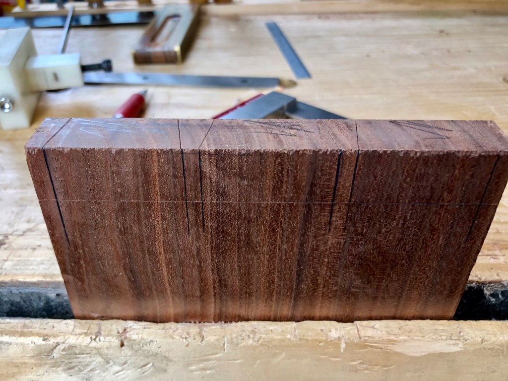 Then I use a marking knife to scribe the pins using the tails as the template.