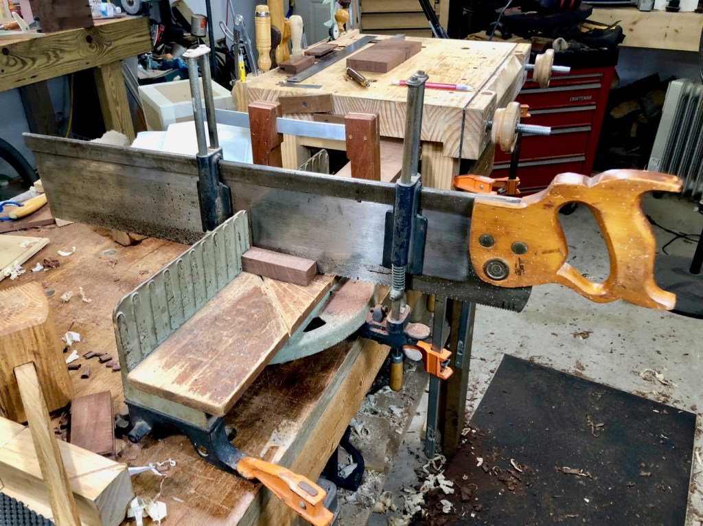 This hand-powered miter saw was made somewhere between 1920 and 1940. I have not even sharpened it yet and it is working well. Once I clean up the saw plate and sharpen it this will be one hard-working tool in my shop.