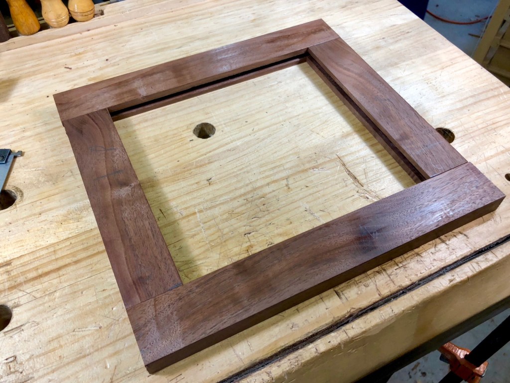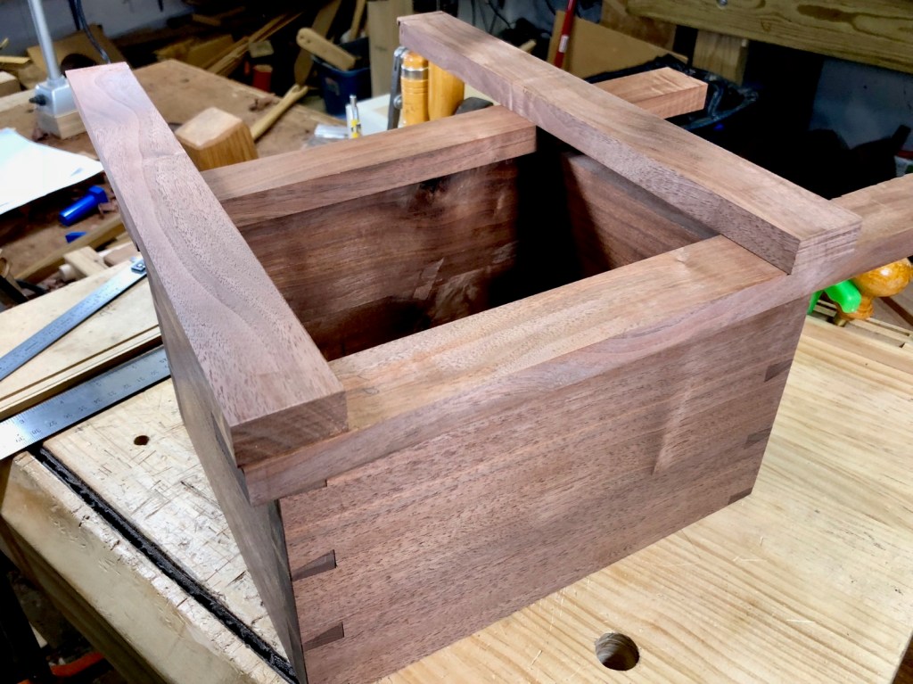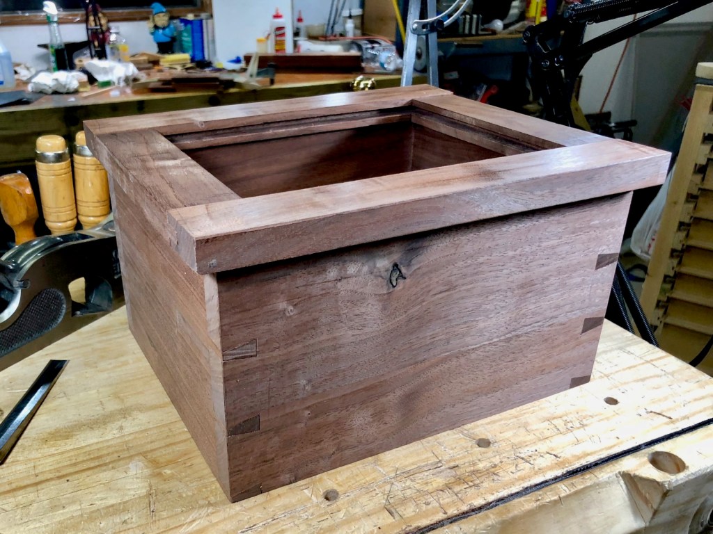 The main box sits in the base. The base will have mitered corners and be chamfered. Here is the box resting on the base pieces. The corners don’t have their miters yet.