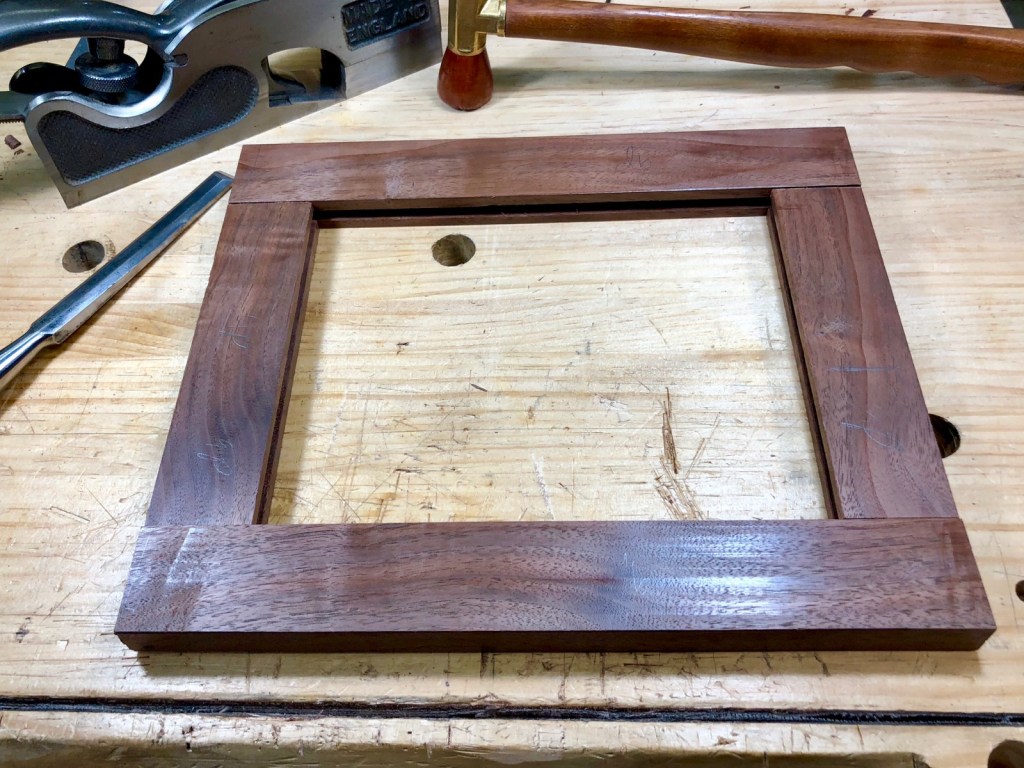 The next step is to make the top of the box. This will use frame and panel construction with a raised panel. I cut the four parts of the frame, called rails, to size with one of my old handsaws.