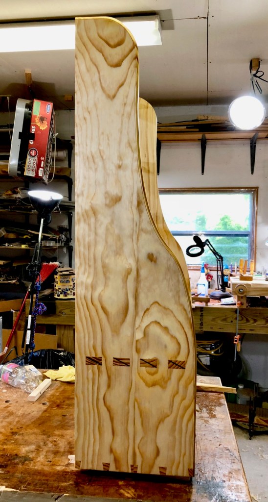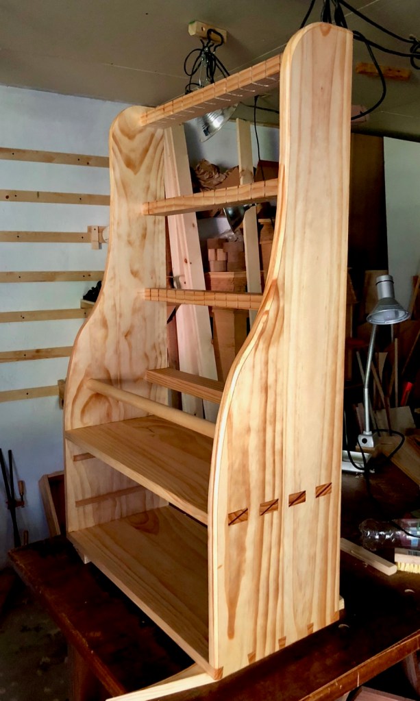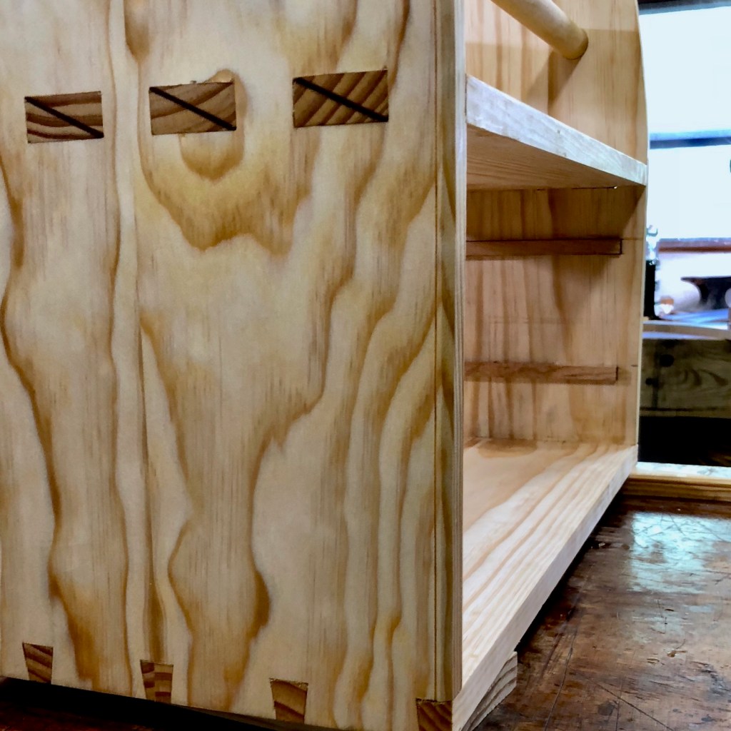 The joints for the shelf are wedged through tenons, a difficult joint. I didn’t realize these are considered harder to do well than dovetails. That’s true for me and I need some practice.