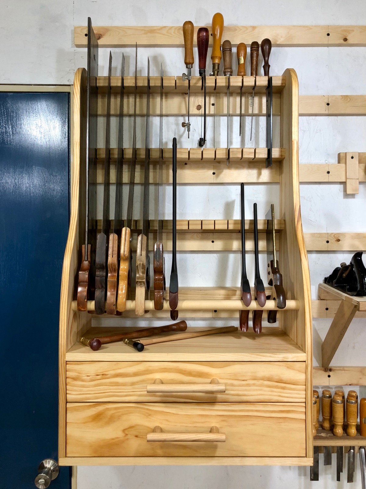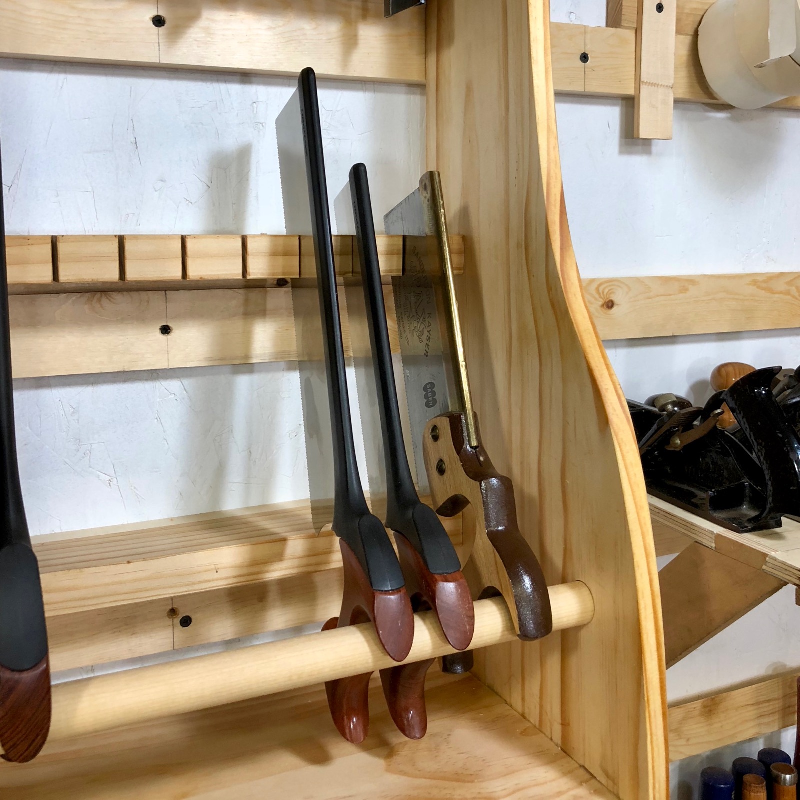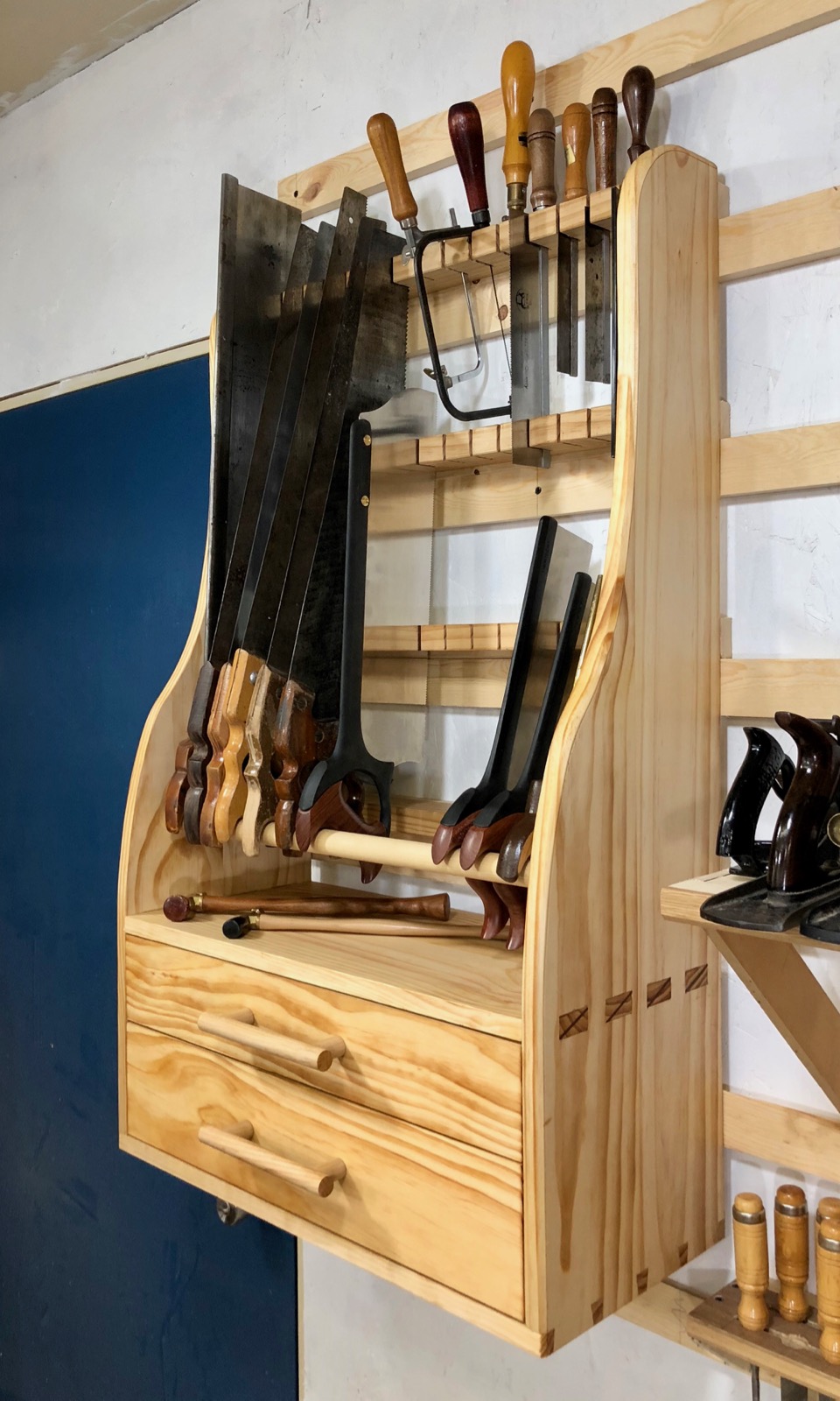 Simple functional saw till made of affordable wood. Perfect place to store a lot of tools in a small amount of wall space. French cleats are the way to go. I love the through box “dovetails which confirms it was made by a professional woodworker. Any woodworking project that is completed quickly – and still looks great – is a joy. Keep up the good work.