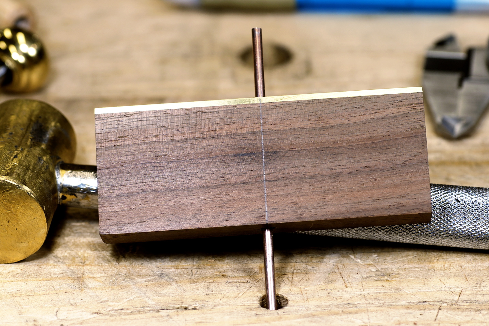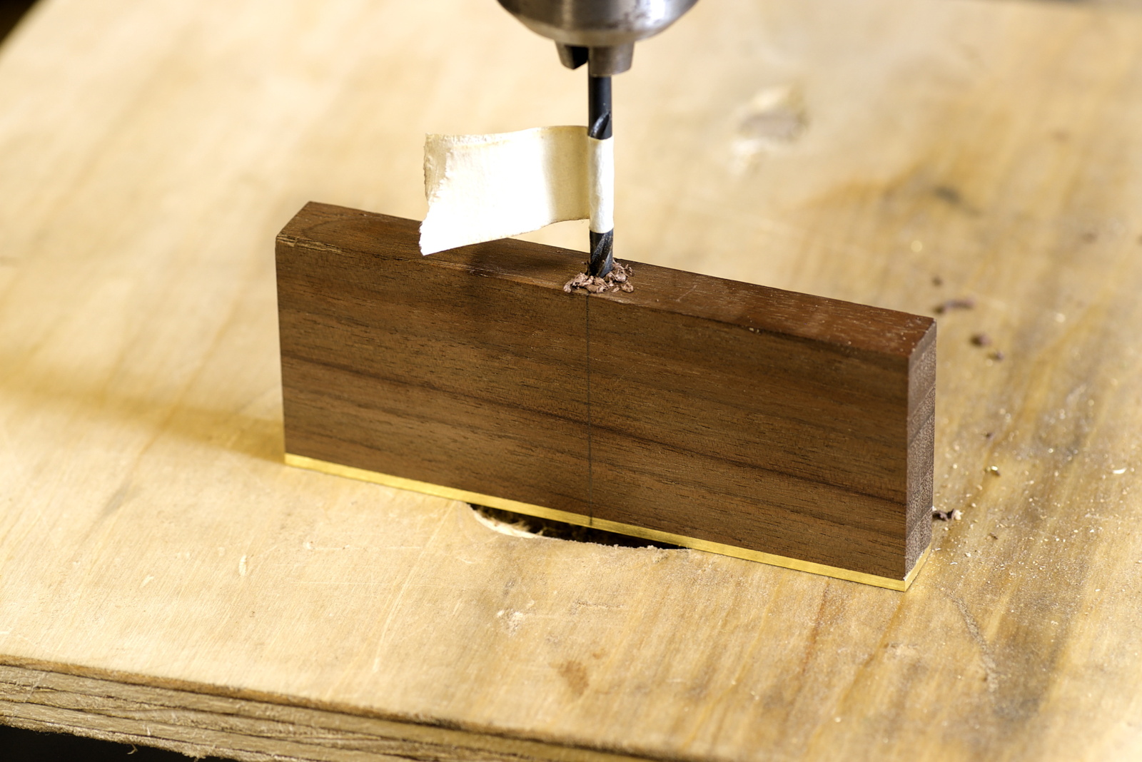 The next step is to drill a precise hole through the walnut for the depth rod.