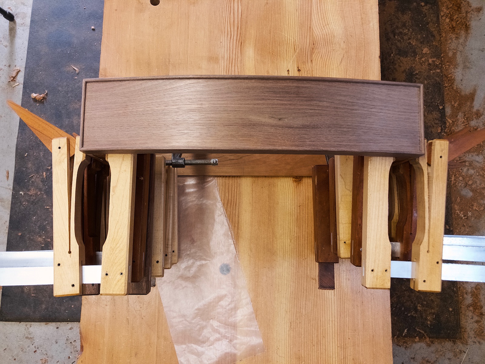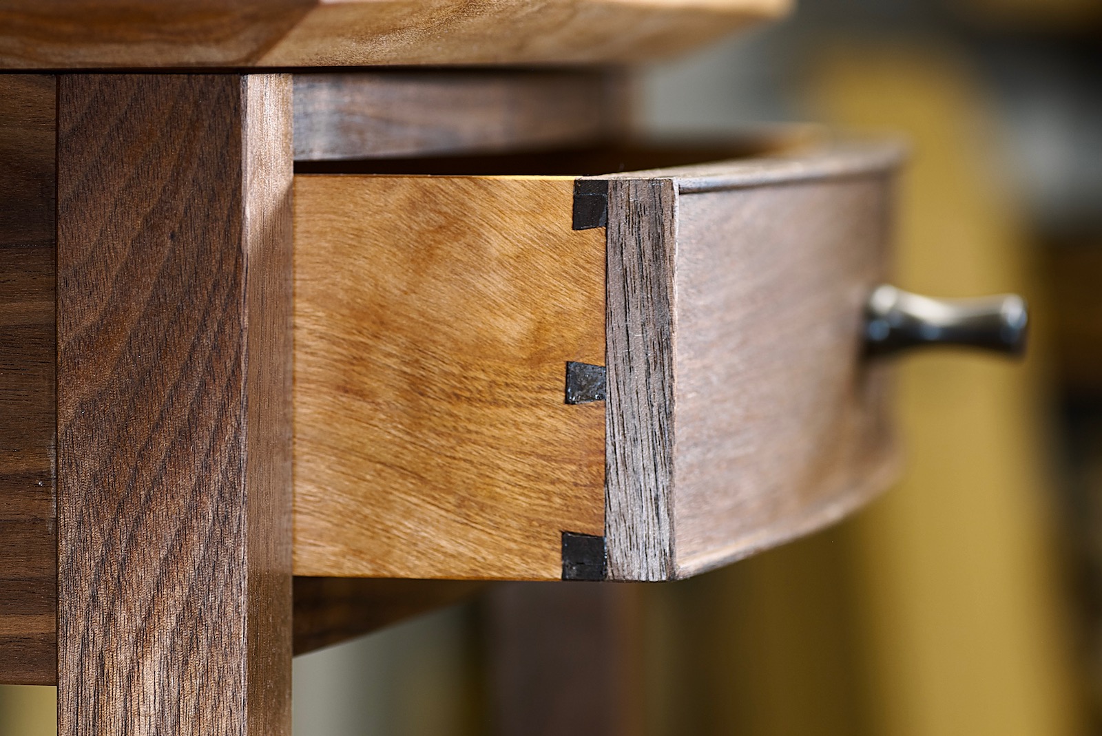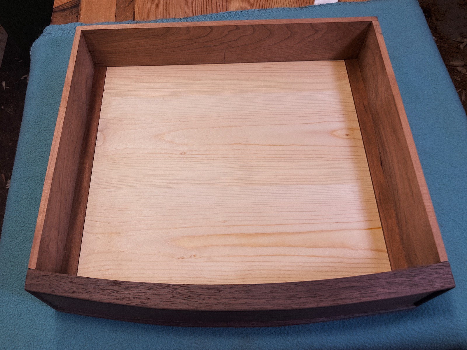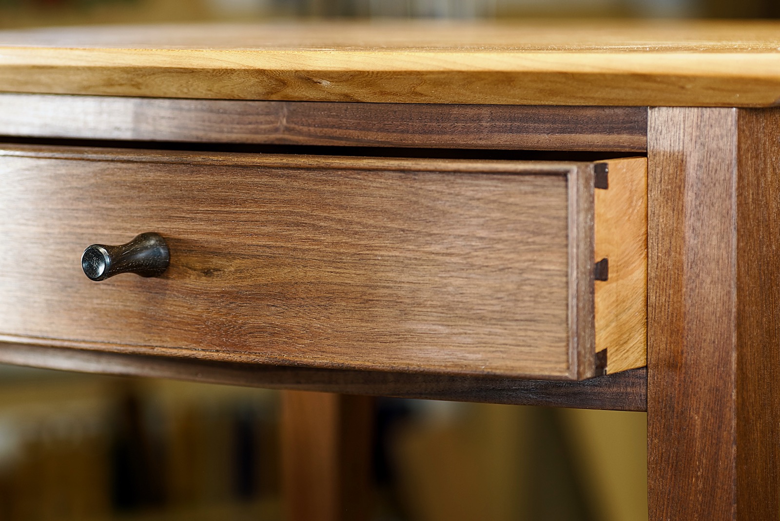 The curved drawer front is three 1/4″ walnut pieces glued together on curved form.